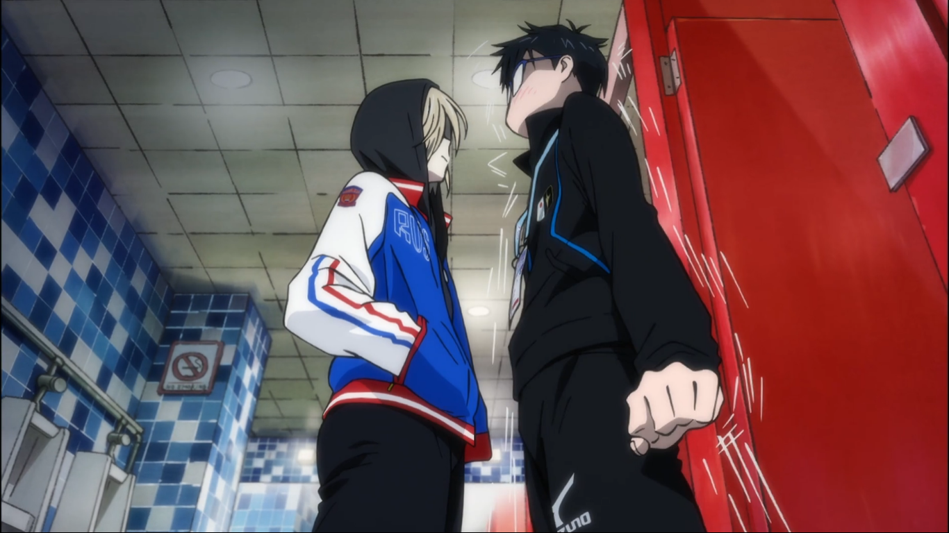 Apart from the appealing settings of figure skating, the plot of YOI is also innovative, if not subversive, compared with mainstream sports anime. As shown in episode 1, the 22-year-old Yuri K is the top male skater in Japan, entering GPF for once though ending up in the last sixth place. In the subsequent episodes, he struggles to overcome his previous failure, kicking off a fresh start in the new season with the coaching of his long-time idol Victor. Then the 27-year-old Victor, a Russian skater and five-time world champion, has known Yuri K at the previous GPF event. He decides to travel to Japan to coach Yuri K after being impressed by a video footage of Yuri K’s skating, an imitation of Victor’s performance in GPF championship. Soon the 17-year-old Russian skater Yuri P, winner of Junior Grand Prix Final and Junior World Championships, also visits Japan to compete with Yuri K for Victor’s coaching. Later Victor develops a relationship with Yuri K that, as the author Mitsurō Kubo states in a magazine interview, is reminiscent of soulmates: